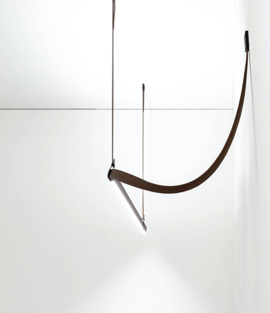 En Belt de Flos, el cuero es el corazón del proyecto. Cada composición desciende del techo o se eleva desde la pared, incluso desde el suelo. Luego, cuelga mediante las correas. Suave y cálido, el cuero garantiza libertad en el espacio. La piel está tratada con tintes naturales para obtener los tres acabados disponibles: negro, verde y natural.