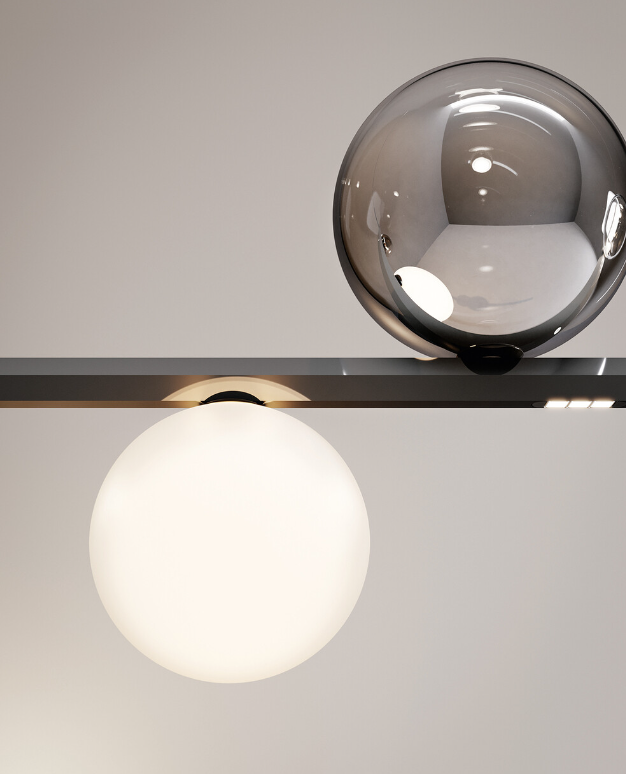 En cuanto a acabados, Random Stick se ofrece en blanco mate, negro cromado y dorado pulido para la barra metálica. Además, las esferas de vidrio soplado están disponibles en transparente, blanco escarchado, cromo, humo brillante, bronce brillante, dorado y dorado rosa. Tal diversidad permite crear originales juegos cromáticos y divertidos efectos de luz que contribuyen a realzar las características de las esferas y del entorno. El tamaño de las esferas también puede variar, entre 10, 12 y 14 cm de diámetro. Así, es posible generar configuraciones en volúmenes y efectos luminosos apropiados al estilo de cada ambiente.