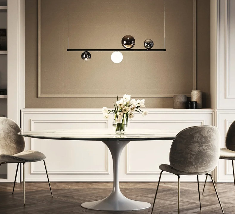 La luminaria corta Random Stick de Lodes mide 100 cm e incluye cuatro difusores y dos fuentes led. Por otro lado, la versión larga alcanza los 150 cm, integra seis esferas y tres ledes. Así, es posible proporcionar una iluminación uniforme a una superficie más larga, como mesa de trabajo o de comedor. Incluso, realiza un desempeño lumínico satisfactorio sobre la barra de un bar o restaurante. Incluso, en entornos amplios es posible realizar instalaciones de más piezas.