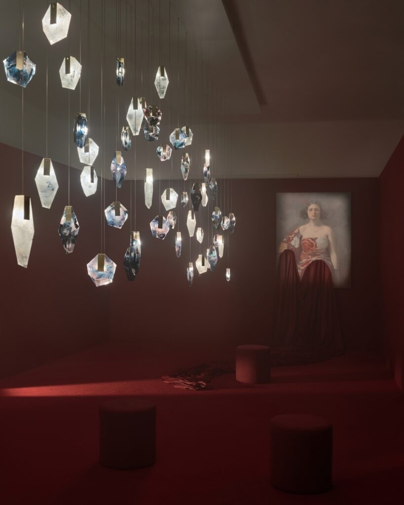 La instalación Cabinets of Reminiscence se integra por reconocidas piezas lumínicas del portafolio Bomma. Flare, Fragments, Dew Drops, Buoy, Orbital, Pebbles con algunas de las colecciones presentes. A su lado, destaca la colección Metropolis, de su marca hermana Rückl. Consta de jarrones, jarras y vasos de exquisita manufactura y diseño inspirado en la arquitectura praguense de los años 60-80. Esta se caracteriza por líneas definidas, detalles orgánicos y contrastes brutalistas.