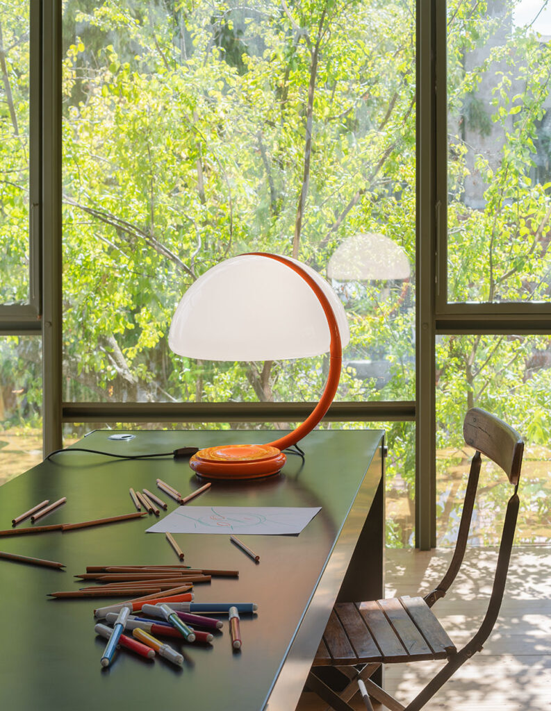 Diseñada por Elio Martinelli, la lámpara de mesa Serpente fue la máxima expresión de una revolución estilística. Aquella que fusiona tecnología, funcionalidad, geometría y dinamismo. Ahora, la pieza regresa revitalizada en ese tono que amplió horizontes: naranja vibrante.