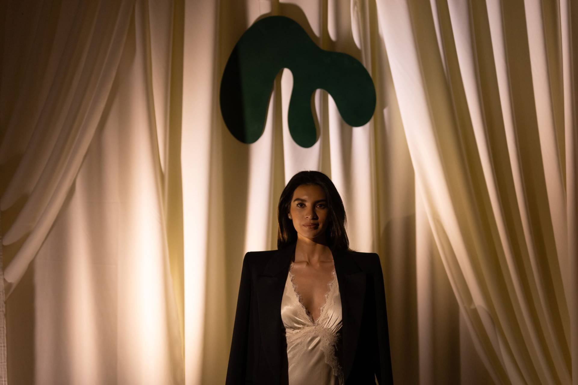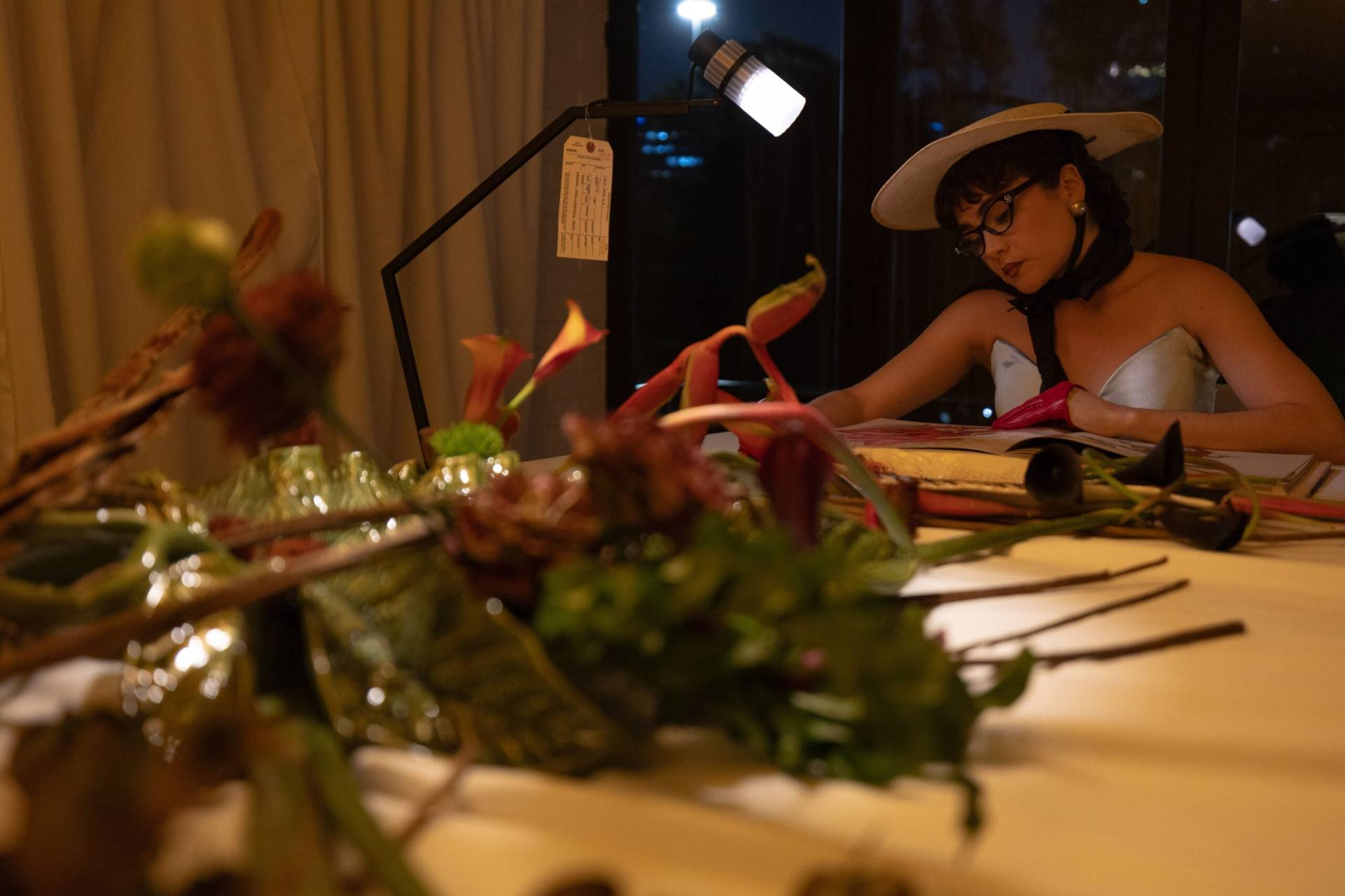 A unos pasos, una mujer solitaria espera frente a una mesa servida para doce comensales. Su gesto, contenido y sereno, se ilumina por las luminarias de Faro Barcelona como una pintura que respira.