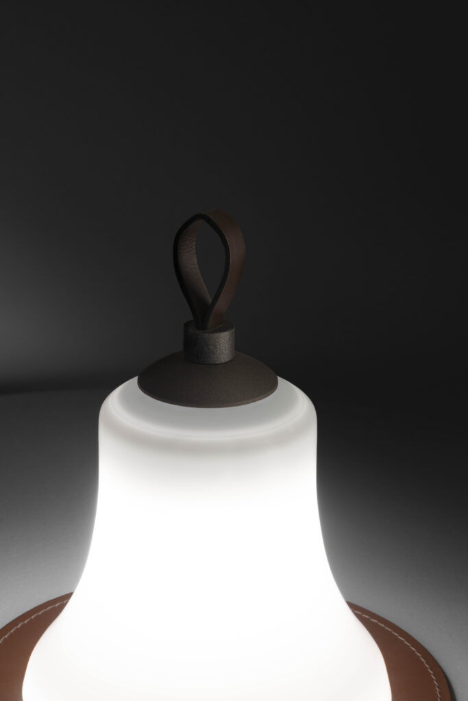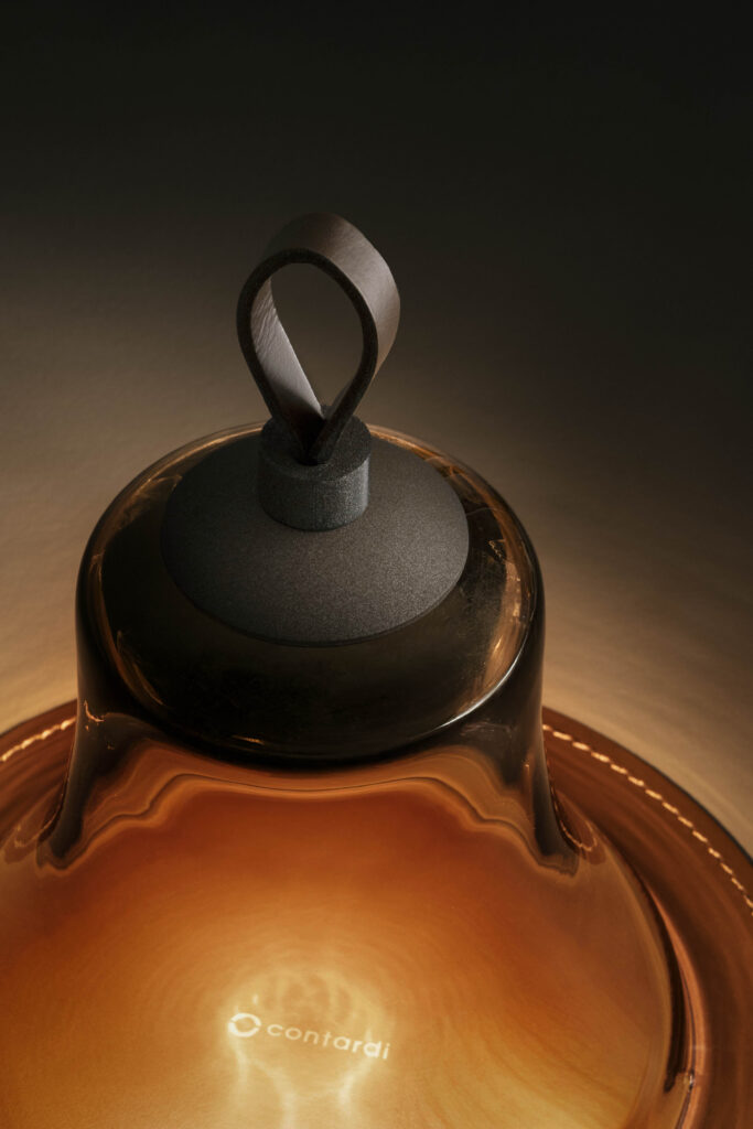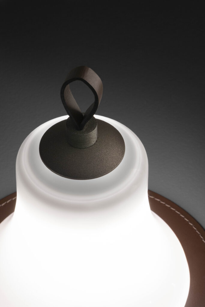 Por otro lado, destaca el asa superior en piel marrón oscuro, a juego con la almohadilla redonda del mismo material. Adornada con el logotipo Contardi, esta base amortigua y protege la delicadeza de la pantalla al posarla en una superficie. Así se completa la pieza con un toque de artesanía y clase. Remind_Me es un regalo que celebra el arte de la hospitalidad. Una lámpara que no solo ilumina espacios, según Contardi, también calienta el corazón.