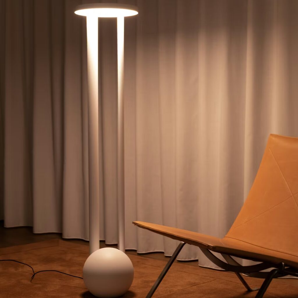 La versión de mesa se forma por dos patas cilíndricas que sostienen un led en forma de disco. Diseñado a medida, se controla mediante un regulador táctil. Por otro lado Composition de piso de Michael Anastassiades está anclada en una esfera sólida. La luminosidad se genera mediante un circuito led con un difusor de plexiglás, que distribuye la luz suavemente hacia abajo. Cada componente mantiene un acabado cálido que aporta profundidad visual sin generar interferencias con otros elementos presentes en el entorno.