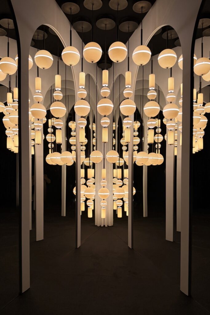 En pasillos, umbrales y recovecos arquitectónicos, la lámpara portátil Chant derrama su cálida luminosidad. Elaborada en vidrio soplado y de forma cúbica, Chant es como una escultura de vidrio artesanal por derecho propio. Por otro lado, la exposición también incluye obras colaborativas recientes. Por ejemplo, la colección Overture con Calico Wallpaper, y Cascade, la serie de lámparas de porcelana diseñadas para Lladró.