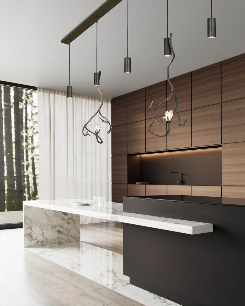 Por otro lado, la estructura metálica luce un acabado de pátina oscura de bronce. Mediante cables de acero de alta resistencia es posible ajustar la altura de la pieza en un cubo de escalera o vestíbulo de techos altos. En espacios de hospitalidad Orpheus de Brand van Egmond se convierte en el punto focal, que contribuye a definir la identidad del entorno, gracias a su perfil escultórico. Así, es una pieza ideal para iluminar vestíbulos y salas en espacios de hospitalidad.