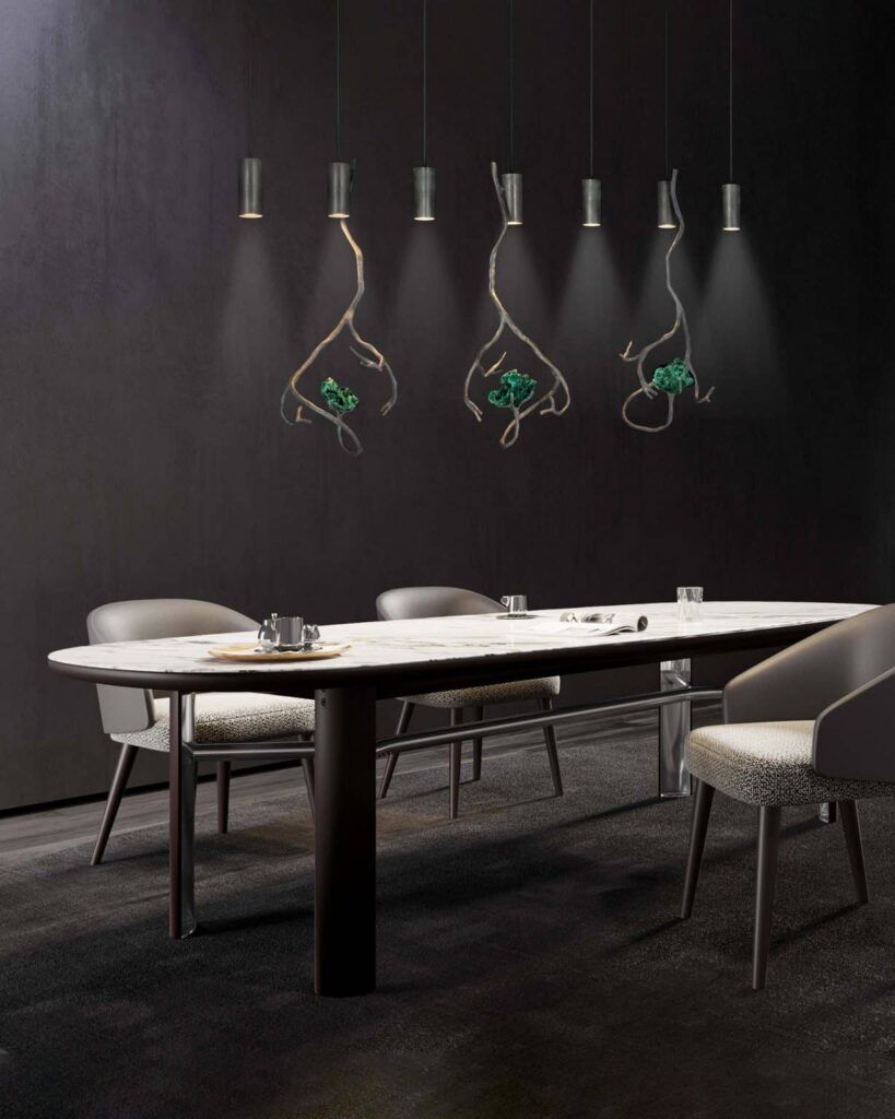 El diseño de Orpheus destaca por su impresionante colección de minerales y piedras preciosas seleccionadas. Cada curva está meticulosamente trabajada a mano en el taller de William Brand, para asegurar una calidad sin precedentes. Esta exclusividad convierte a la lámpara en el centro de atención de cualquier espacio residencial o comercial de lujo. Con raíces en los minerales de la Tierra, ahora adopta una presencia cautivadora mostrando la armonía entre naturaleza y arte.