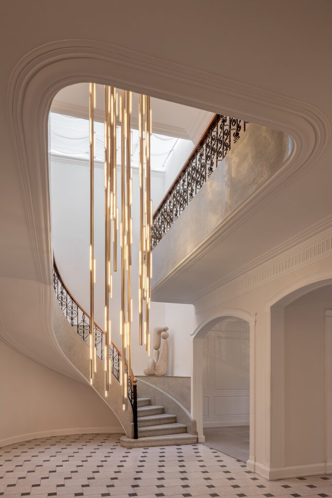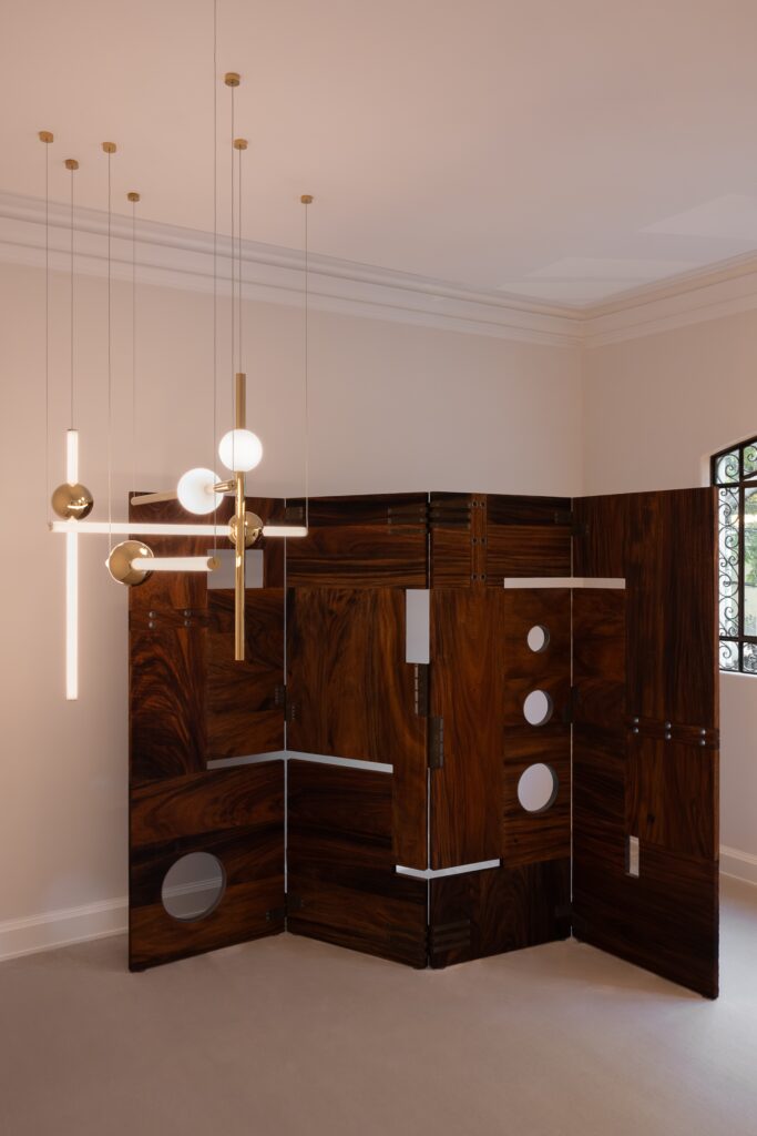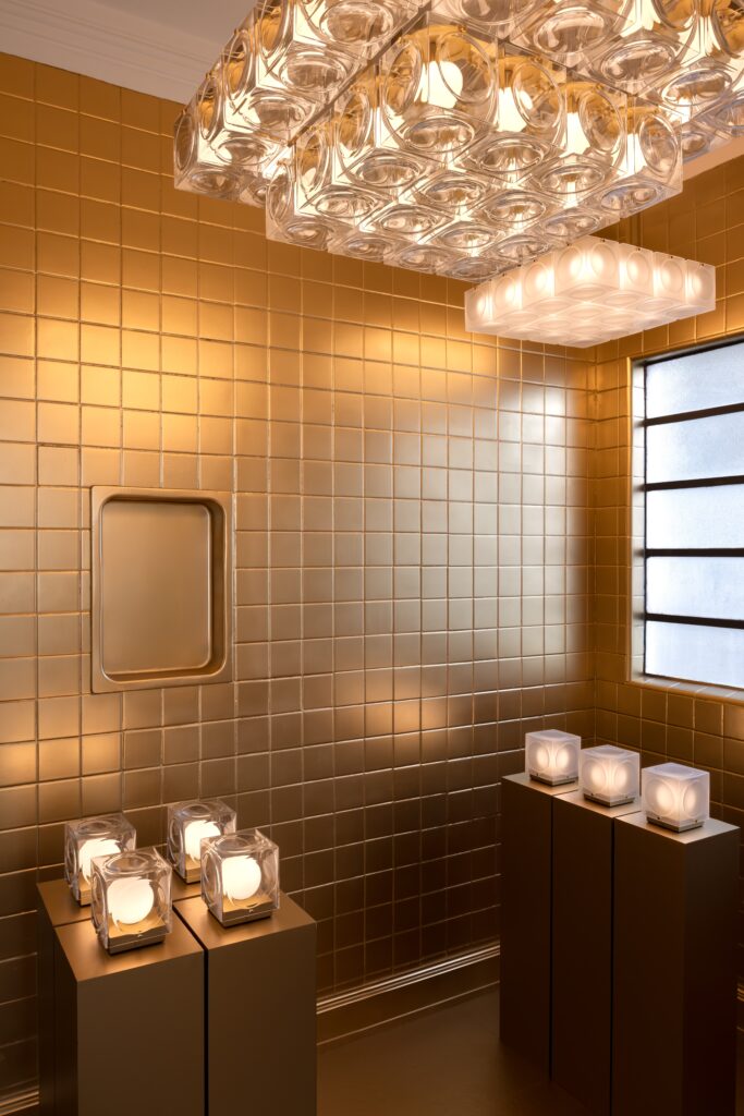 Dispuestos en una cuadrícula que imita la geometría de los azulejos, candelabros y lámparas portátiles Chant crean un espacio elegante y alegre. La luz que emiten se multiplica en el entorno dorado, con un marcado aire de los años 70. En el invernadero, la lámpara de araña King refracta la luz a través de sus hojas de oro cepillado. Así, el lugar se anima con movimiento y reflejos únicos.
