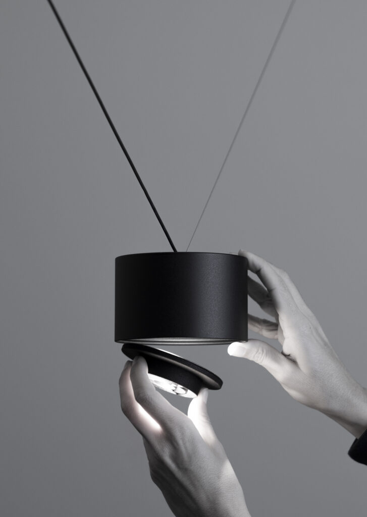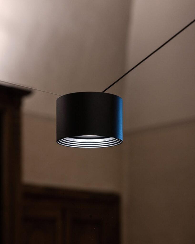 Su fino cable de alimentación convierte a taO de Davide Groppi en un trazo gráfico que recorre espacios. La luminaria se presenta como un cuerpo negro suspendido que parece flotar libremente en cualquier ambiente. Su diseño destaca por su minimalismo puro que transforma la percepción del entorno con una elegancia sutil. Esta pieza convierte la ausencia de masa en una declaración estética, reduciendo la iluminación a su esencia.