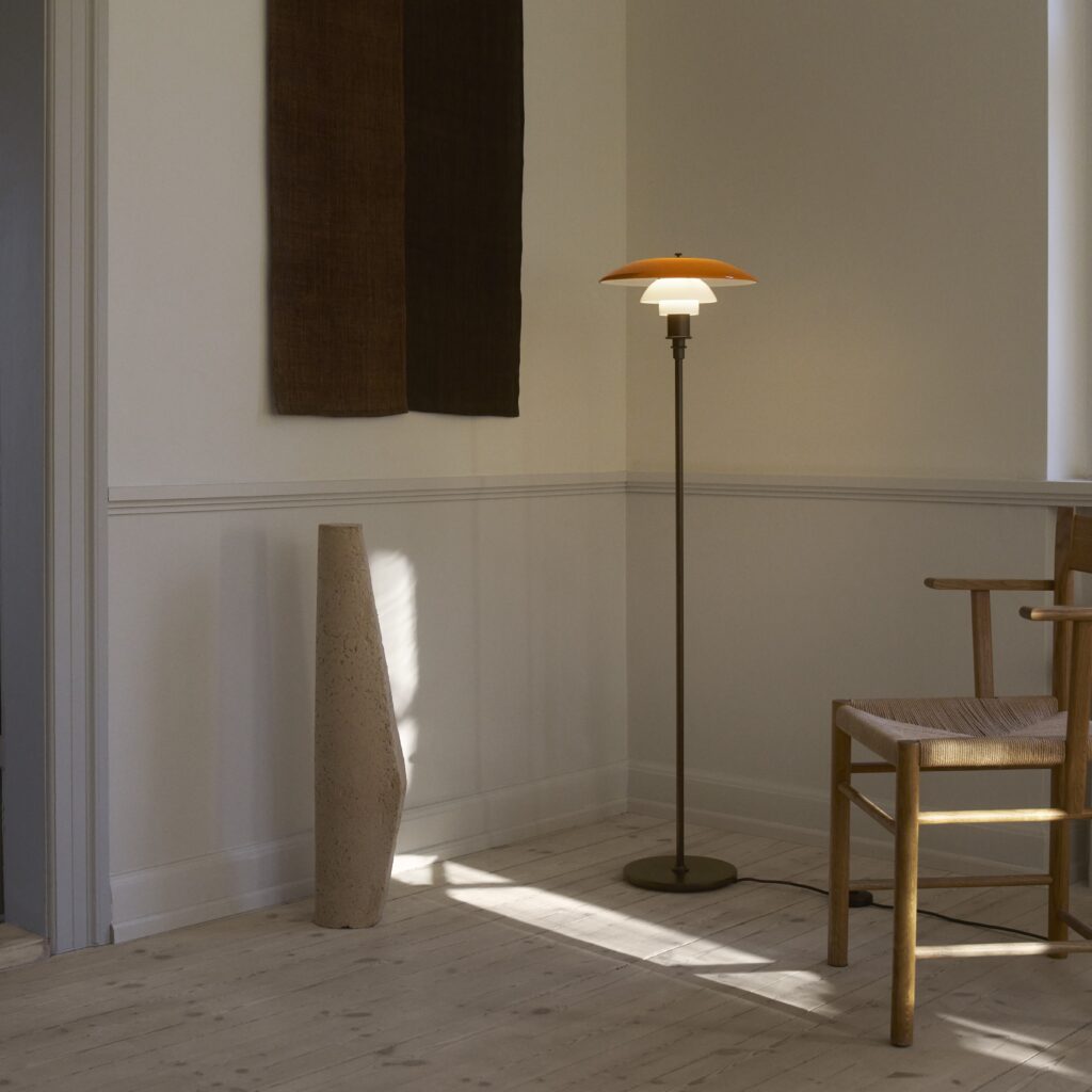 La PH Centenary de piso mantiene la estructura de latón envejecido cuidadosamente lacado para preservar la pátina. Soporta una pantalla superior de vidrio amber de cuatro capas y pantallas inferiores de vidrio soplado blanco opalino, de tres capas. Así proporciona al entorno luz ambiente ascendente, a la vez que entrega luz difusa suave dirigida hacia abajo. Su presencia aporta un toque vintage a cualquier entorno.