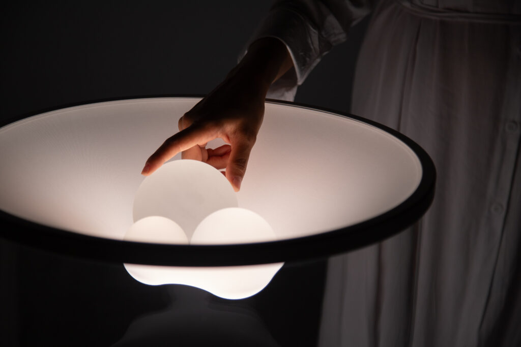 Para encender la luminaria y regular la intensidad de la luz es preciso posar las esferas sobre la tela elástica. El peso de las esferas estira el tejido que se deforma creando una superficie suave y dinámica. Así, Grammoluce difunde luminosidad de manera uniforme y siempre cambiante.