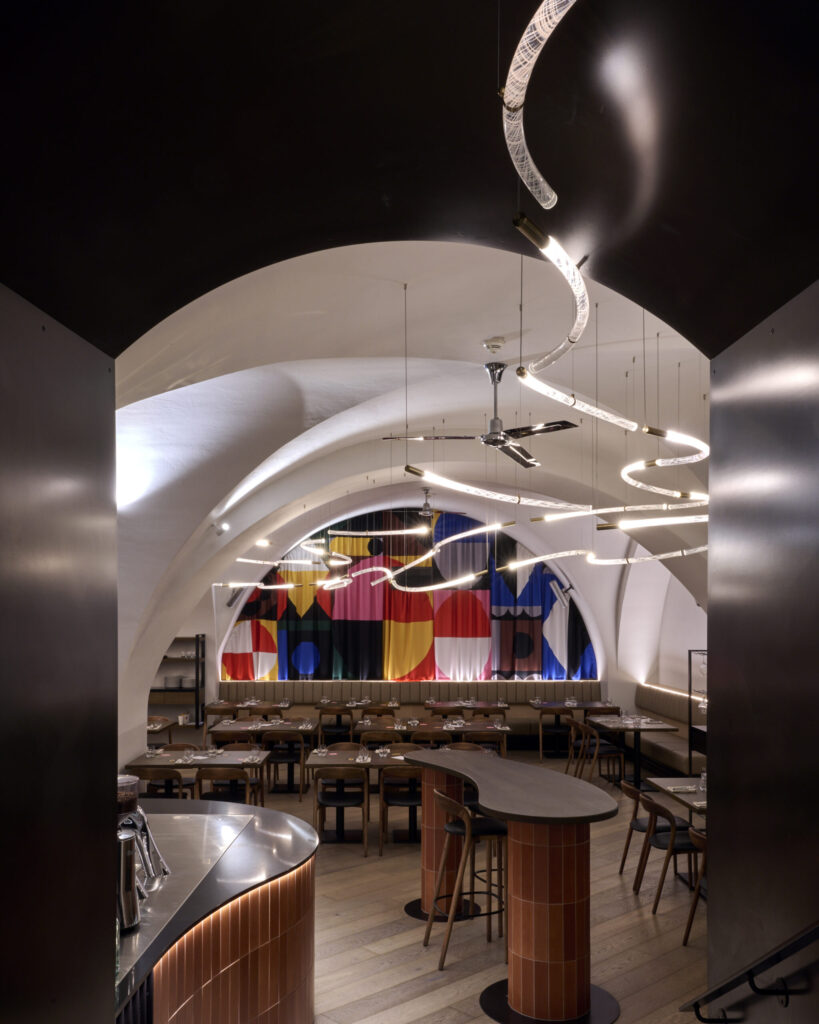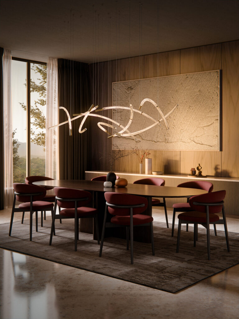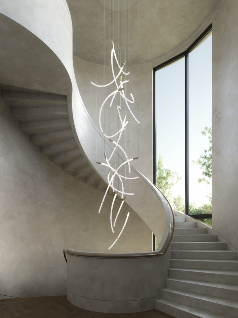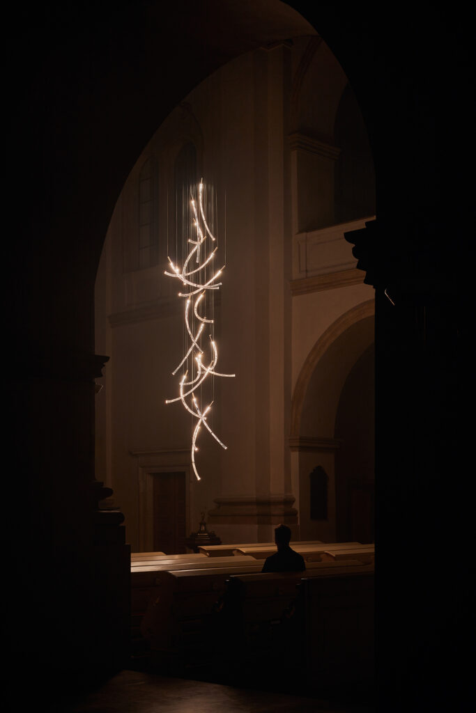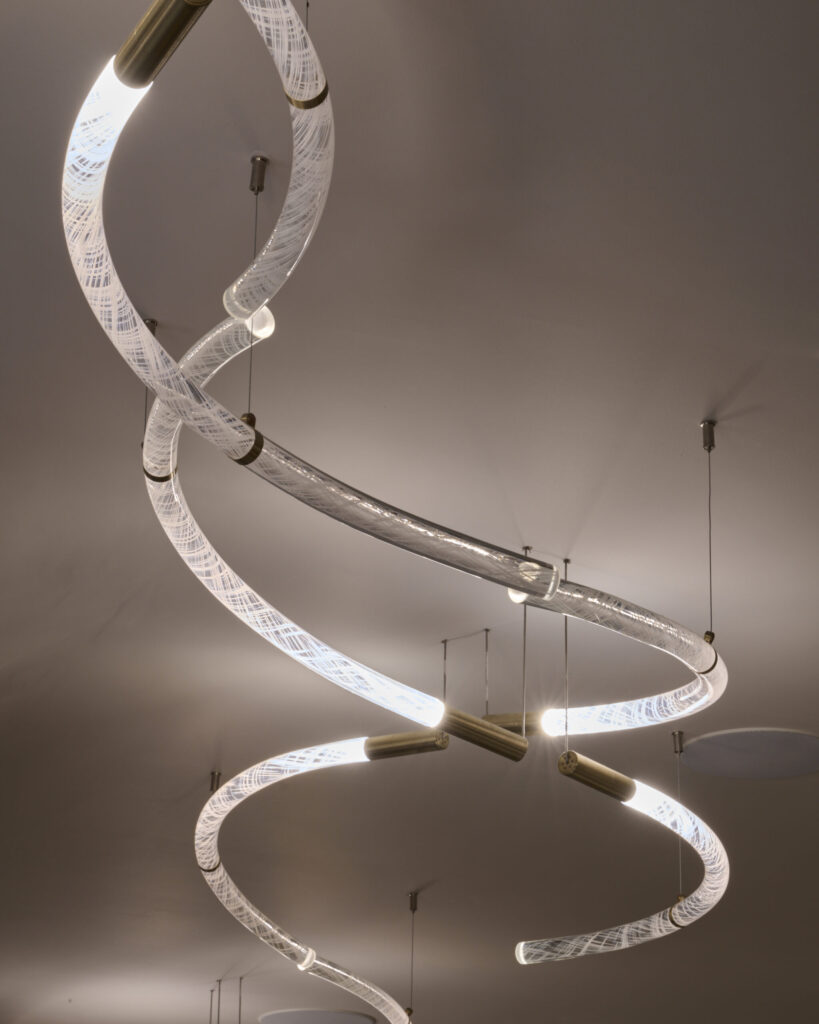 La versatilidad de Flare de Bomma permite disponer las varillas en líneas rectas, espirales o composiciones asimétricas de forma libre. Así, es posible crear instalaciones tan grandes como el espacio lo permite. Por eso, la demanda es alta para iluminar ambientes comerciales, donde su cálida luminosidad contribuye a generar una atmósfera íntima.