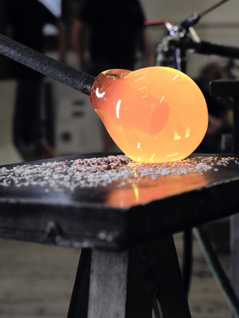 En Flare, el efecto de remolino se logra mediante una técnica tradicional de fabricación de vidrio. El núcleo de vidrio fundido se recubre con fragmentos del mismo material y luego se sumerge de nuevo en cristal fundido. Enseguida, el maestro vidriero estira la pieza hasta alcanzar la longitud deseada.