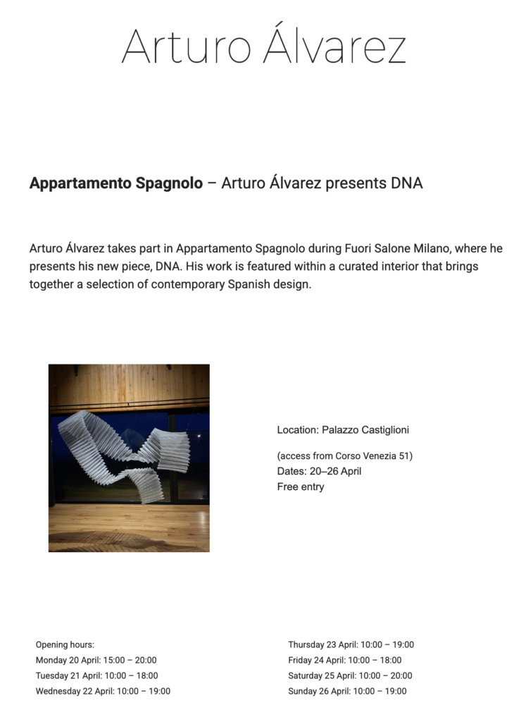 Forma parte de Appartamento Spagnolo durante el Fuorisalone, donde presenta su nueva pieza, DNA. La obra se exhibe en un espacio interior cuidadosamente diseñado que reúne una selección de diseño español contemporáneo.