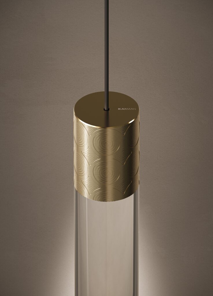 Con estructura metálica, Smug de Karman está disponible en versión colgante, ideal para organizar combinaciones suspendidas e instalaciones escénicas. Además, la versión de superficie es una solución de iluminación minimalista y esencial para espacios con techos bajos. En ambas versiones, la estructura metálica está fabricada en aluminio, realzado por una sutil textura decorativa. Esa textura que envuelve las juntas de aluminio revela su carácter precioso y sofisticado. Todo en ellos denota un gusto refinado y elevado.