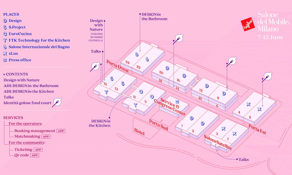 La muestra incluirá siete exposiciones dedicadas: el Salone Internazionale del Mobile, la Exposición Internacional de Accesorios de Decoración, Workplace3.0, la Exposición Internacional de Baño, S.Project, la bienal EuroCocina y FTK, Technology for the kitchen. Además, se realizará la muestra SaloneSatellite. Con 600 diseñadores menores de 35 años, esta última se expondrá por primera vez en los dos primeros pabellones.